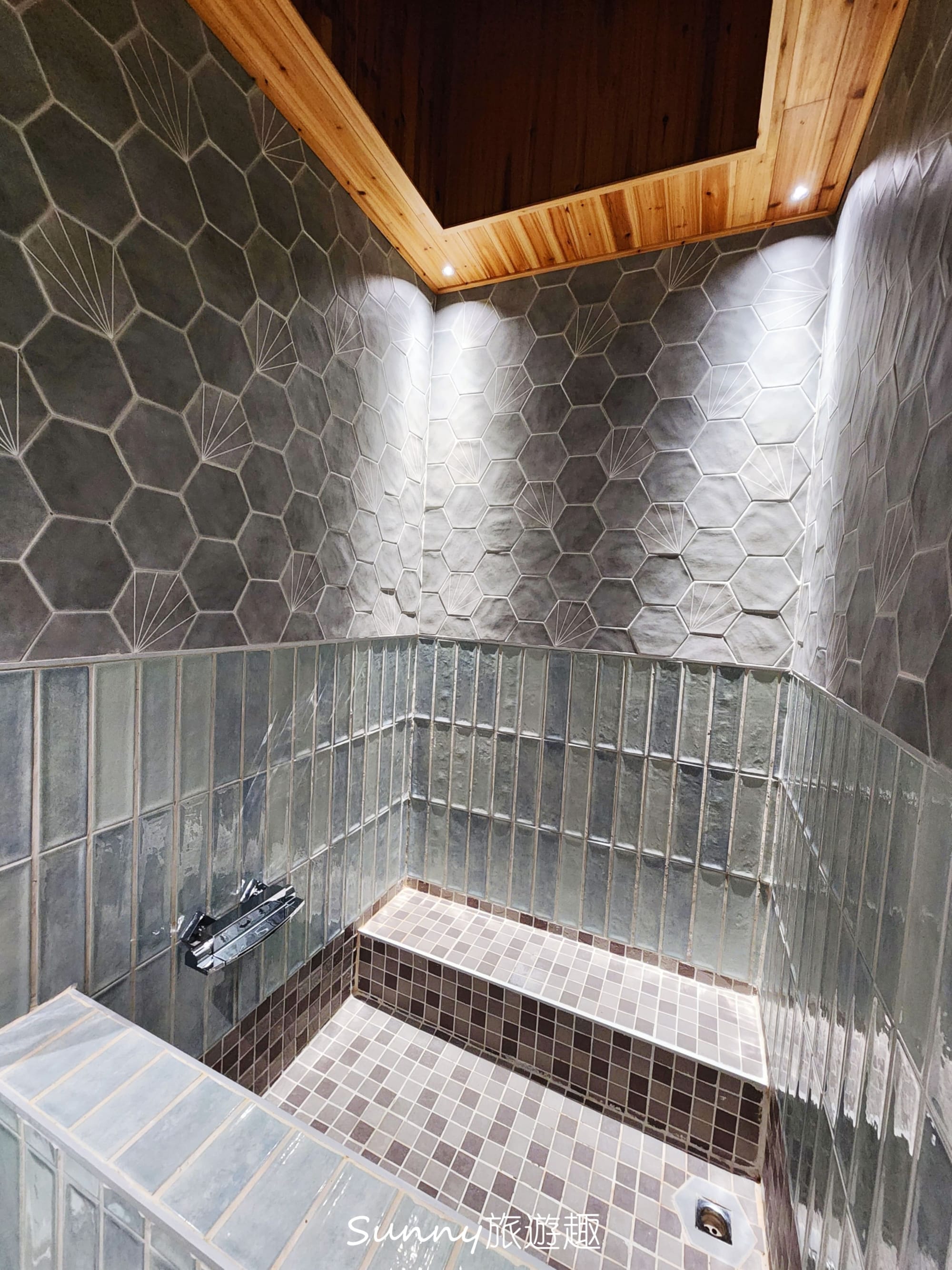 牆面選用了三種不同顏色與造型的磁磚,層次感很明顯,但搭配起來卻不會雜亂,反而意外地和諧,讓整個湯池空間看起來很有質感,泡湯的體驗也跟著升級不少。