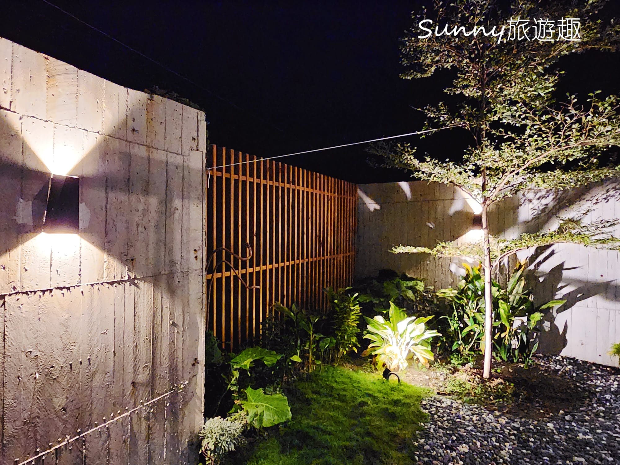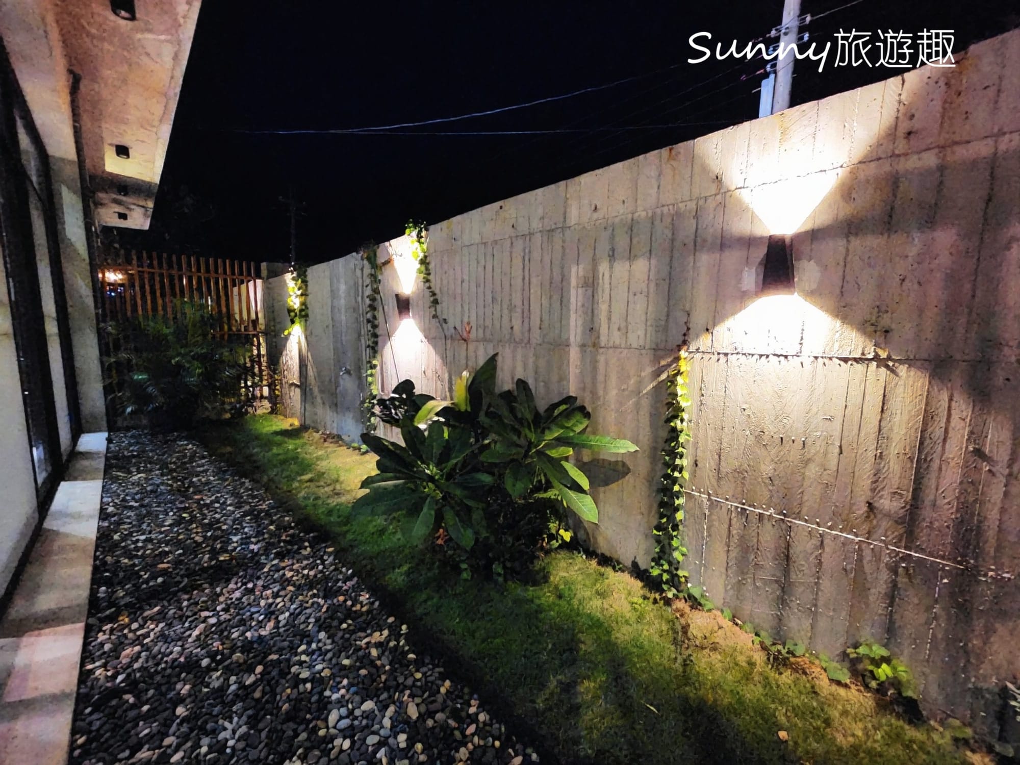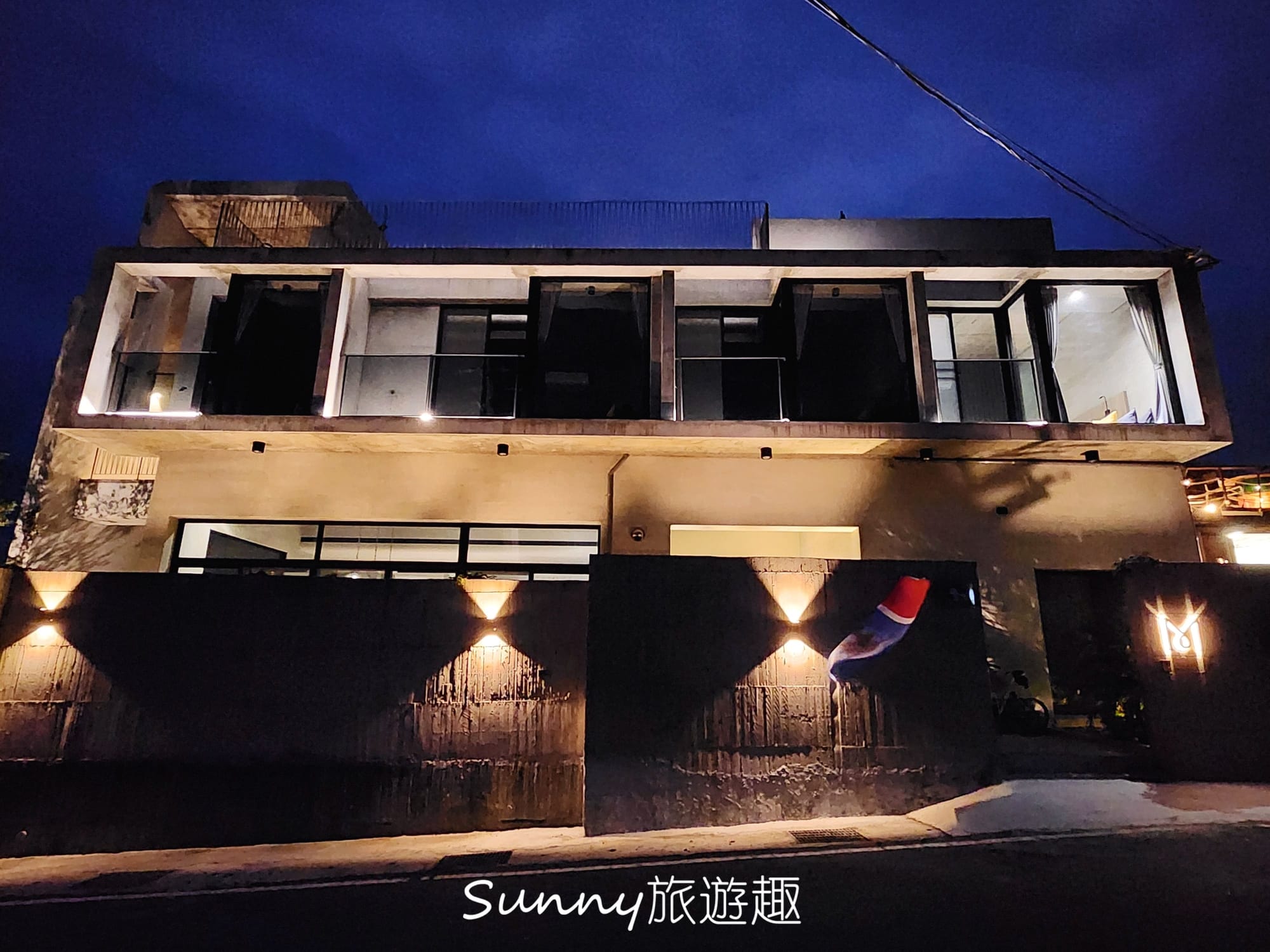 民宿是一棟兩層樓的清水模建築,簡約又靜謐,夜晚的燈光照的建築物別有情調。