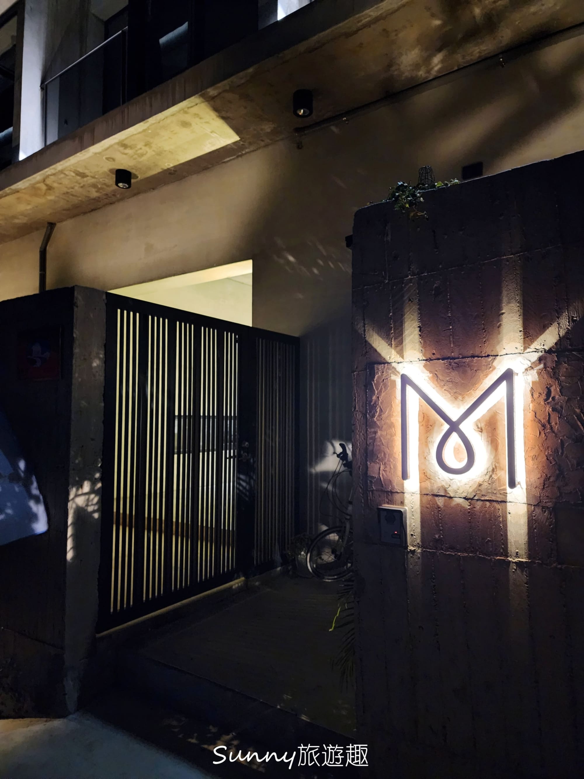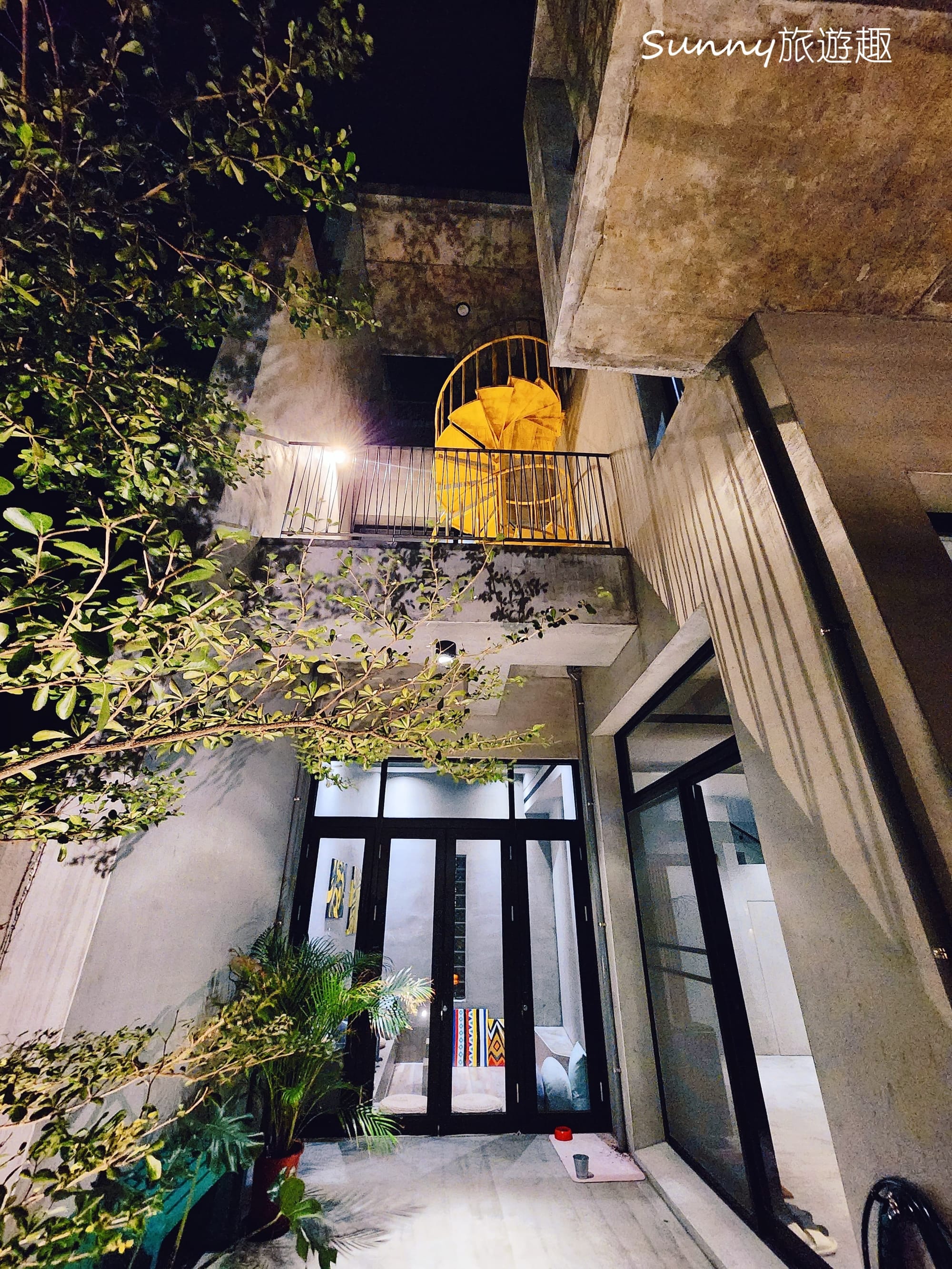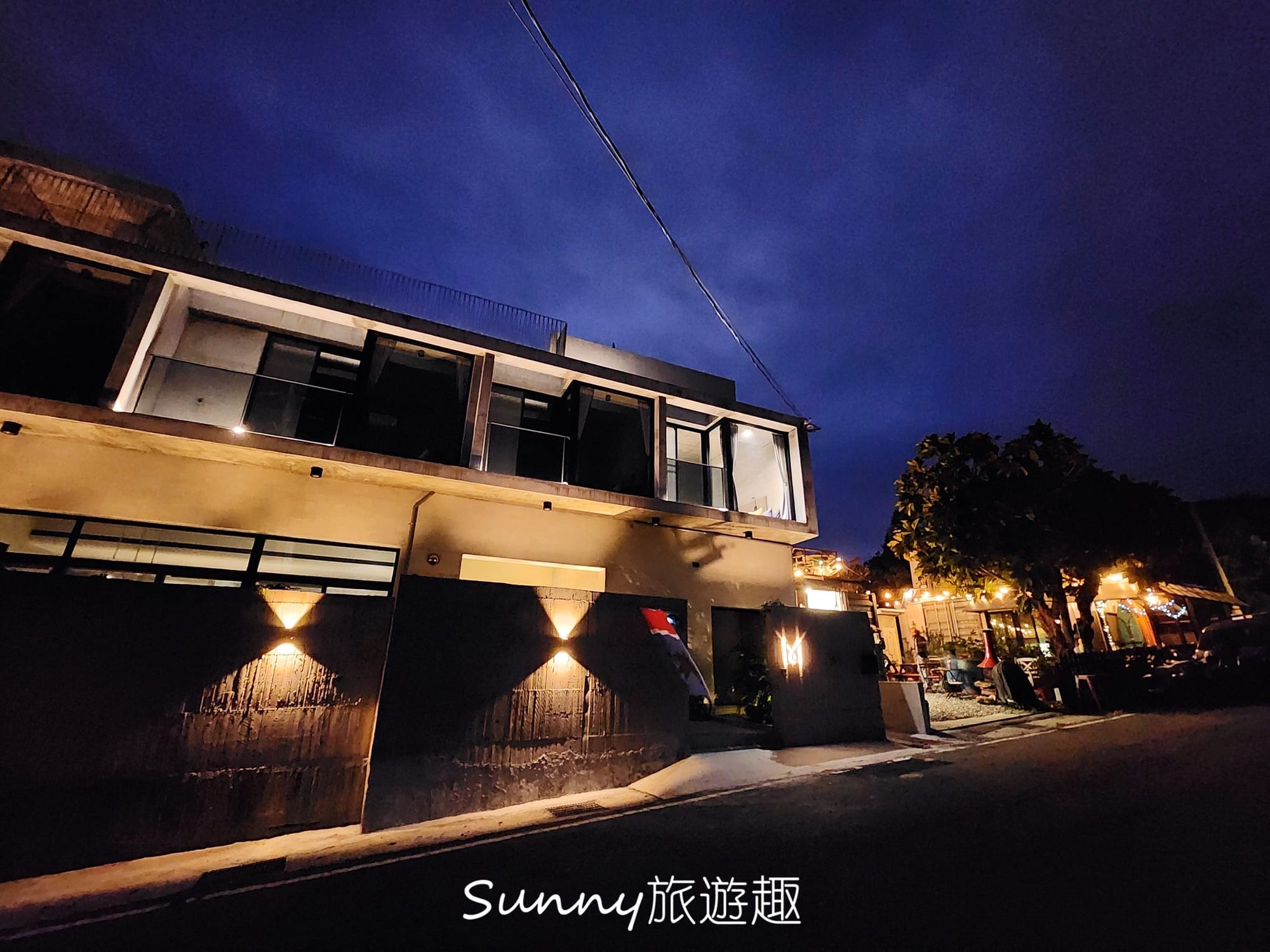 民宿是一棟兩層樓的清水模建築,簡約又靜謐,夜晚的燈光照的建築物別有情調。