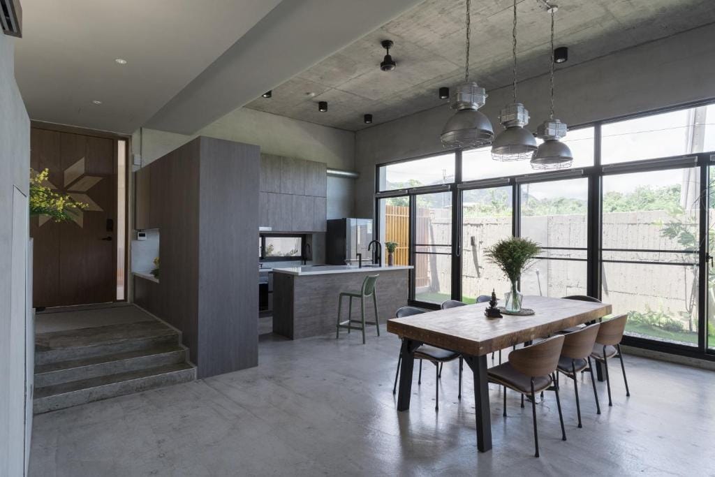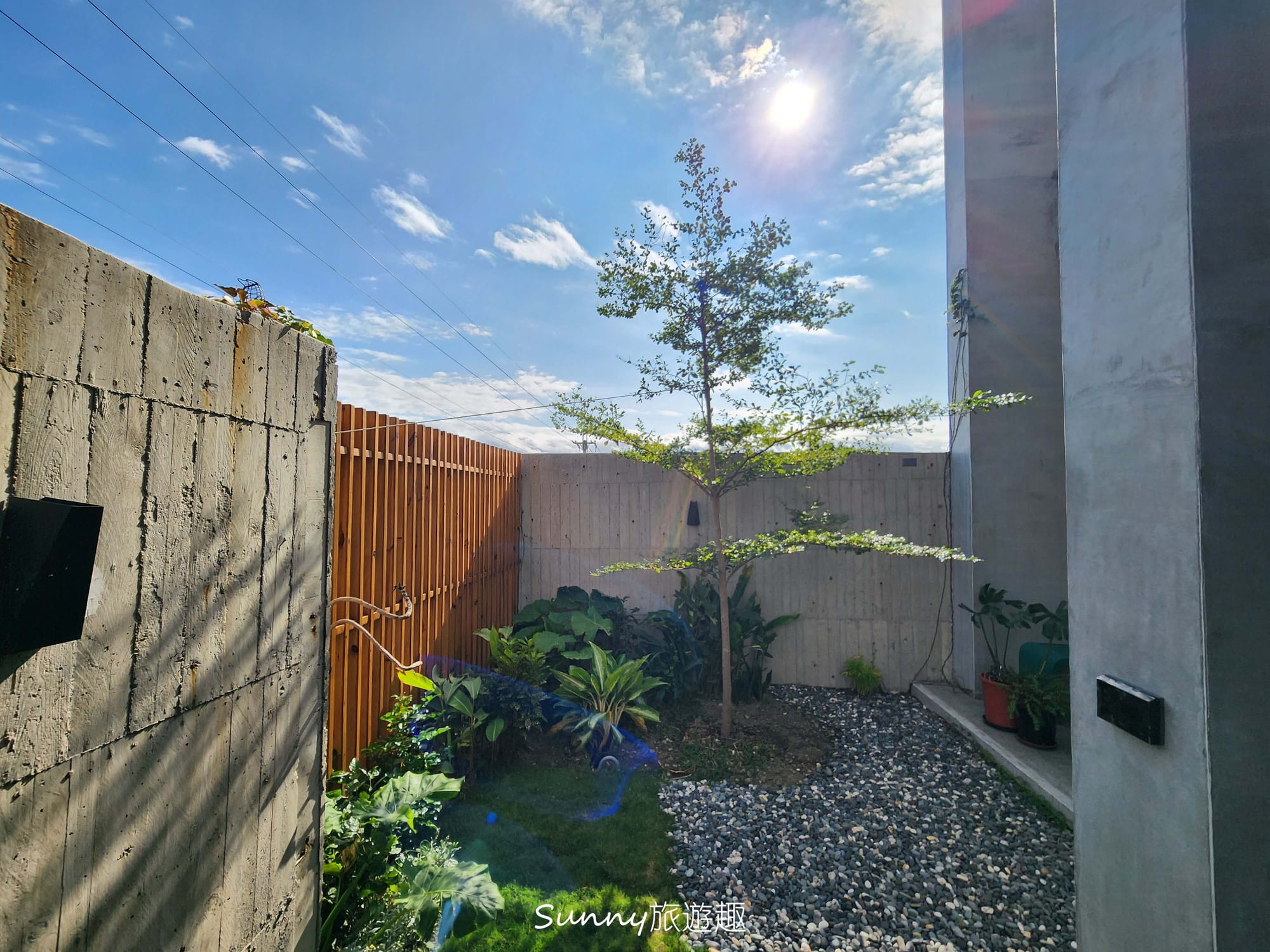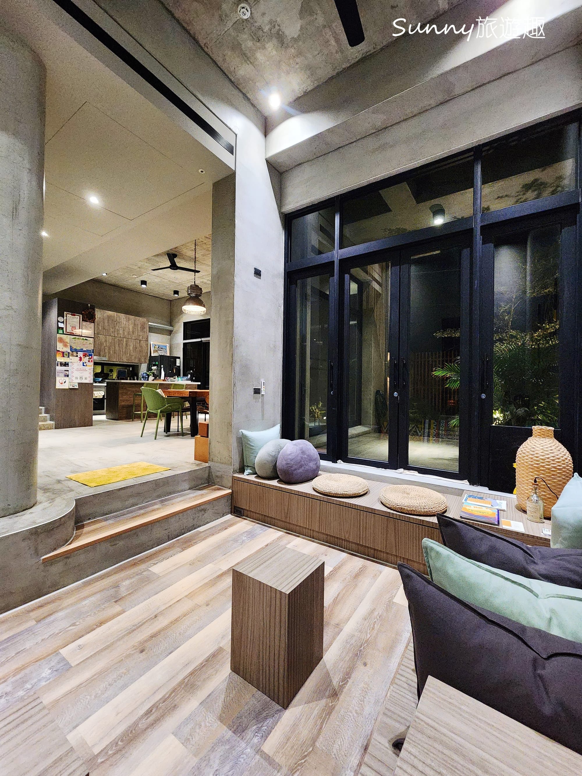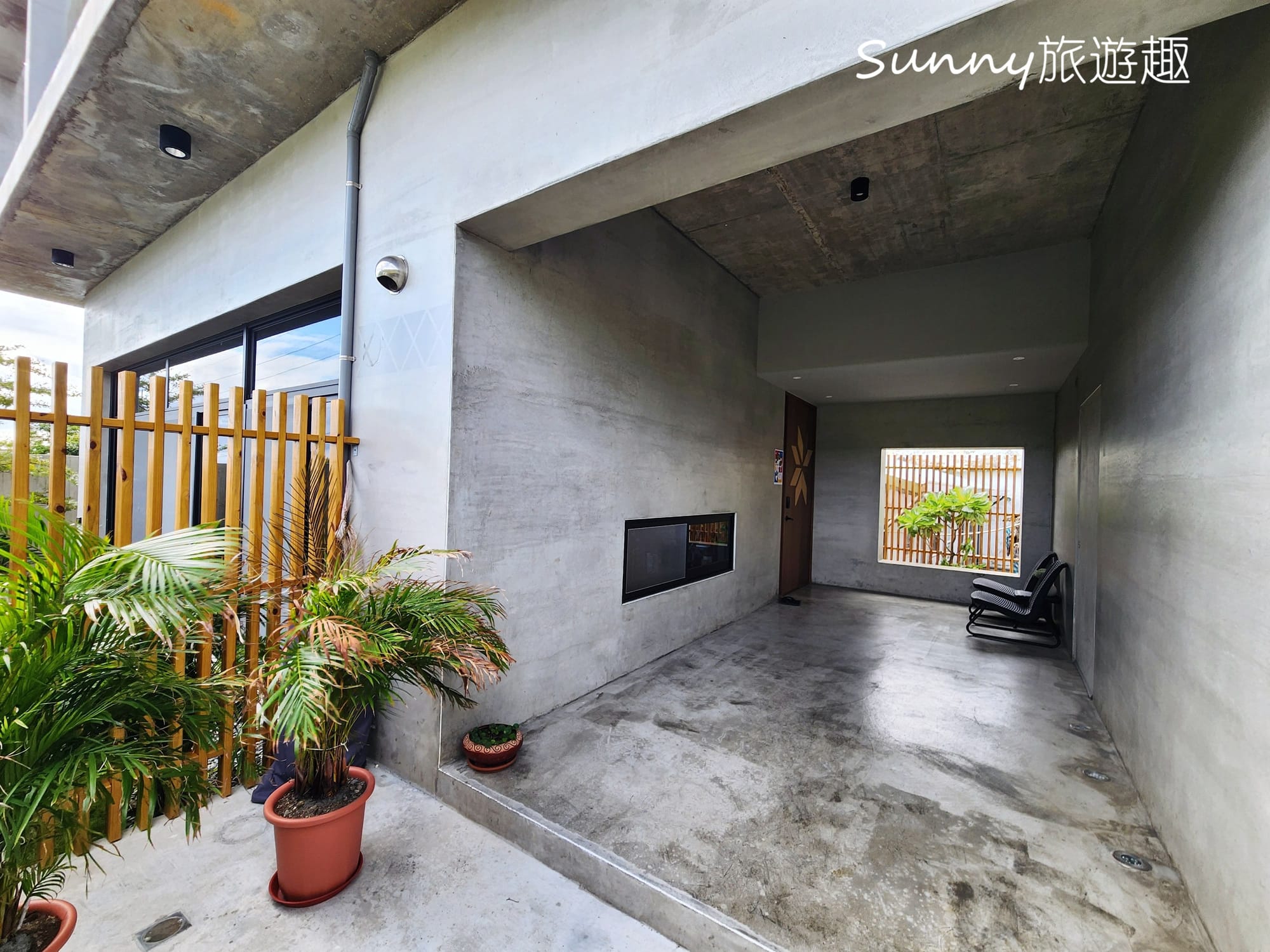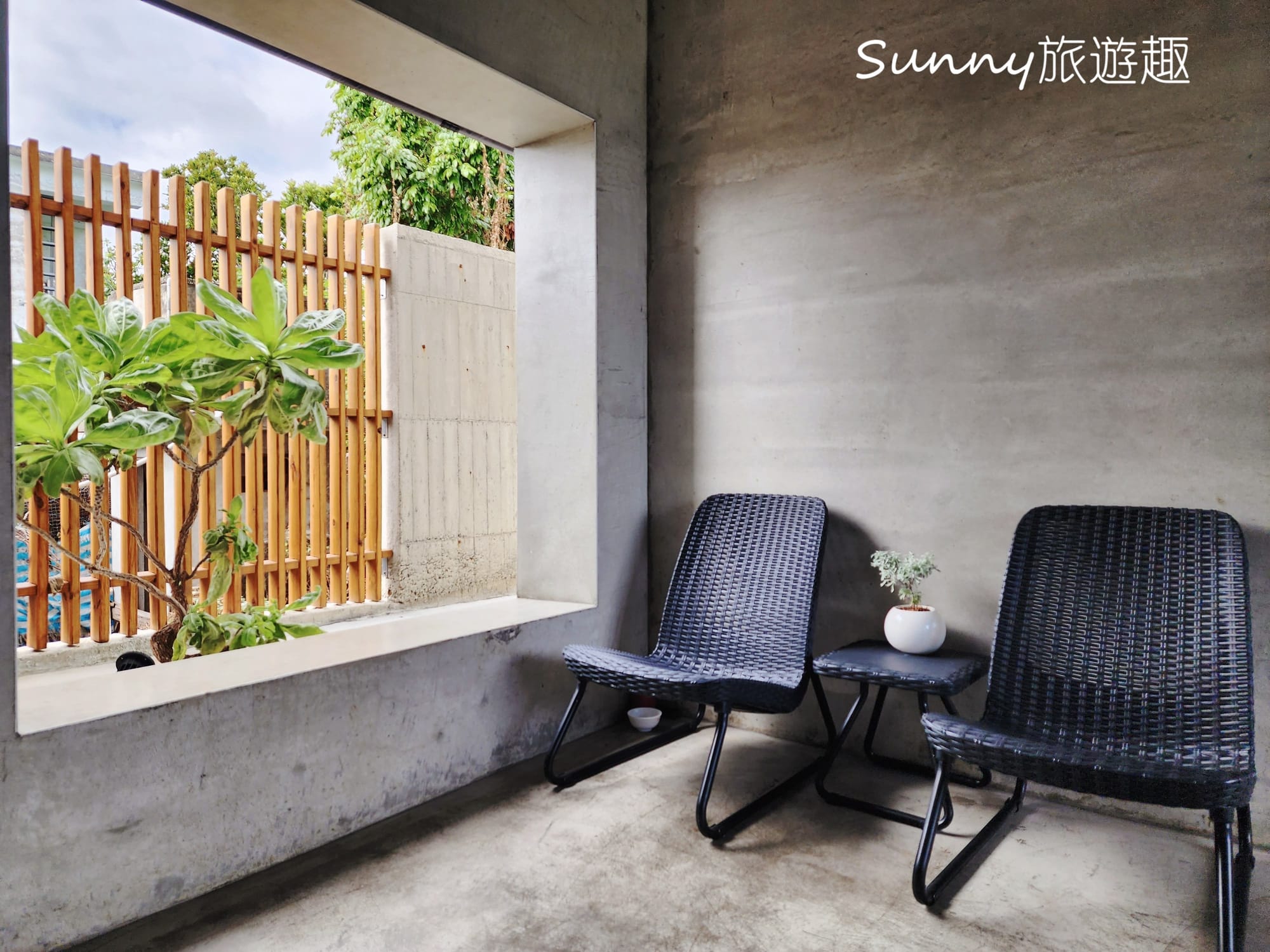 雖然建築物是比較冰冷的清水模,不過民宿前後陽台都有做庭園造景,大量的植栽點綴,讓整個空間氛圍其實是感覺到很舒適跟放鬆的。