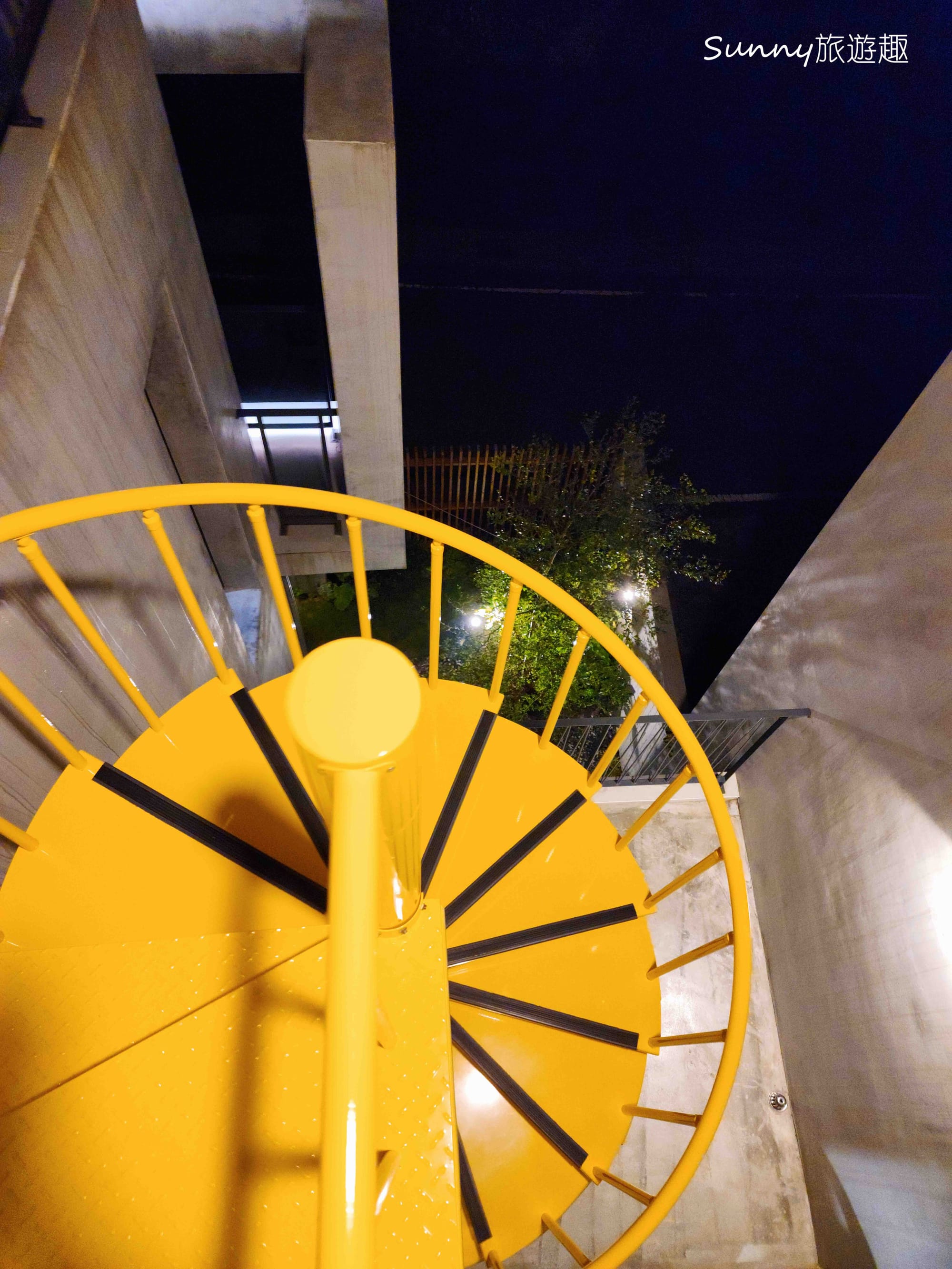 抬頭一看,黃色旋轉梯,像是整棟建築物畫龍點睛的元素般存在,老闆說順著樓梯上去可以到頂樓,如果天氣好的話可以看到滿天星空呢!
