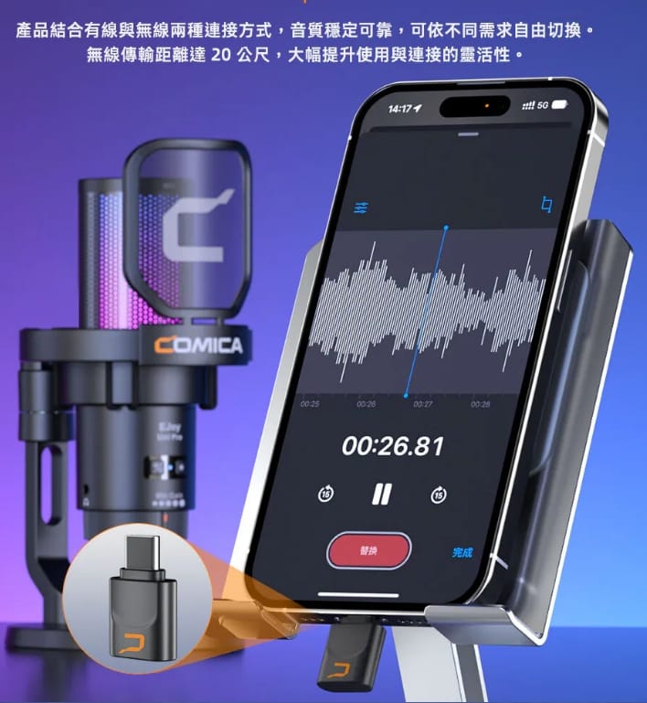 以我個人的使用需求來說,平常錄音時會同時用到電腦跟手機。Comica 無線麥克風同時支援電腦與手機錄製,不用為了不同裝置再準備兩套設備,對我來說真的方便很多。而且接收器是USB-TYPEC,手機不用額外轉接頭就能使用,也很方便。