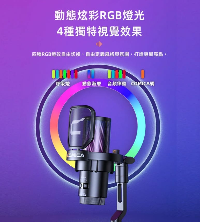 呼吸燈、動態漸層、音頻律動、COMICA 橘,可依風格切換。玩電競遊戲的朋友很能增添氣氛效果。
